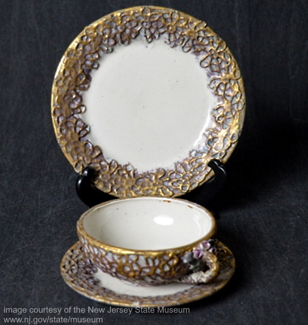 This unusual tea cup, saucer, and dessert plate set is signed M.B. Cybis on all three pieces. Additional photos are in the Tableware post. The black numbers are the museum’s inventory codes.