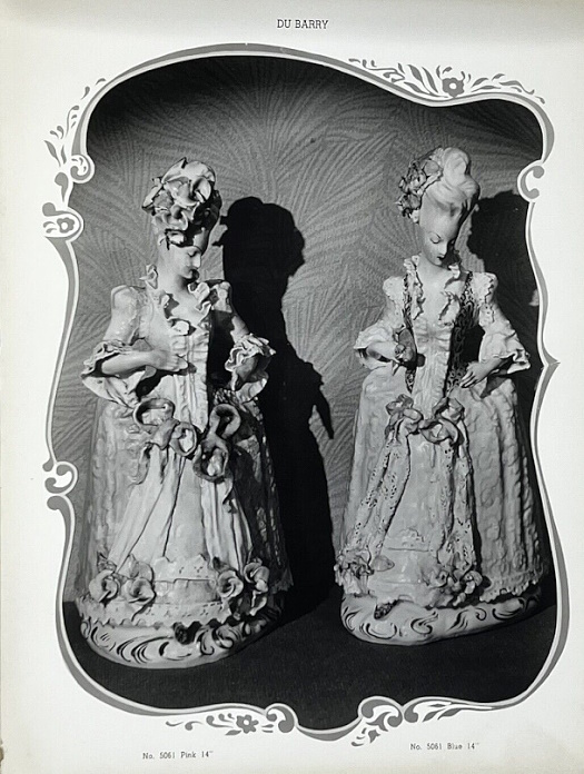 Thanks to a helpful Archive reader, I can include this M.B. Cybis version of the lady who appears in the Cordey catalog as Du Barry (one of their two versions of Madame Du Barry, the other being the bust.) The dipped-lace panniers on the M.B. Cybis example were laid atop the basic lower body (hips) mold shown in the Cordey catalog. My guess is that the panniers began life as a lace-trimmed handkerchief that was cut to the proper shape and size.