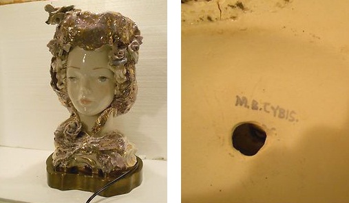 A vintage magazine article about Cybis porcelain included these photos of a lady bust with roses and scarf which is clearly marked M.B. Cybis.