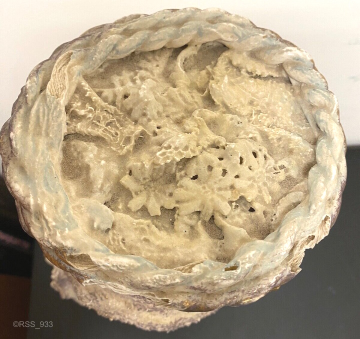 This overhead photo of the top of the headdress shows how it was constructed. The lengths of porcelain ‘slip’-dipped lace were literally piled up in a coil. The top edge of the headdress was made from a dipped rope or string; the broken off surface at the upper left reveals the threads or string from which it was constructed.