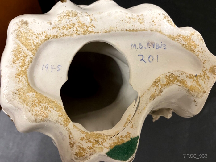 This lady bust with a conical hat has more Cordey markings than the lone M.B. Cybis signature! There is the Cordey mold impression, the design number mold impression, and the design number handwritten not once but twice (why?).