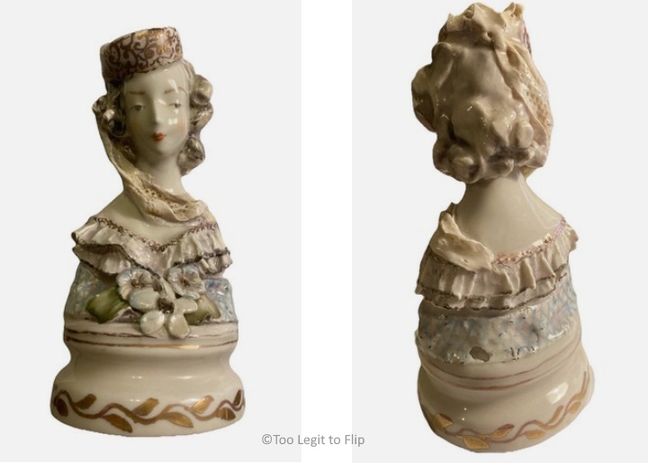 Here’s another example of this mold; it was put onto a lamp base to create a lady bust lamp. Was this a later conversion? Or was it originally made as a boudoir lamp (because the base shape so closely matches that of the lower part of the porcelain)? This bust was numbered #105 according to the seller’s description although their photo does not show it.