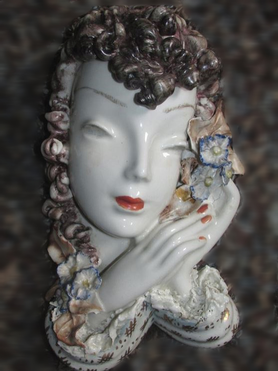 Lady-face wall hangings and wall pockets were very popular during the 1940s, and I have noticed a few Cordey examples for sale online in recent years. However, those were not the same mold as this one. This is the first lady-face wall hanging that I have seen that is signed M.B. Cybis instead of Cordey. For some reason, the seller decided to photograph it against a shag rug that is the same color and texture as the lady’s hair…so I have blurred that background as best I can.