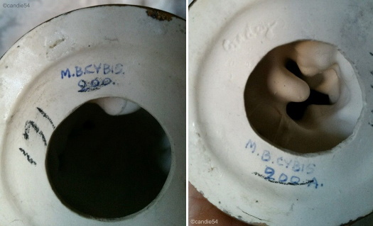 Here is the M.B. Cybis signature AND also a ‘Cordey’ signature in the same blue paint. This is really very odd and I can’t fathom why it was done this way. Yes, there are several dual-marked items in this post but those combine the M.B. Cybis signature with either a Cordey mold impression (because the body mold had already been cast for a Cordey branding) or a Cordey design number (probably for the same reason.) Perhaps the same artist painted this one and also the one with the pointy lace headdress and orange collar?