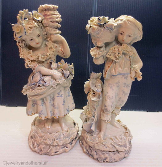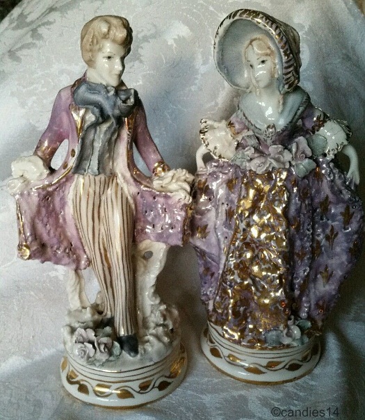 Here’s a pair that have dual signatures: both Cordey and M.B. Cybis. This couple is smaller, at about 11″ high, and is very much in their ‘old world European’ style. These were clearly made as companion pieces, shown by the design numbers being 200A and 200B. Yet another lavender-and-gold color scheme! Because of the posture of the two figures, I’m going to dub them the Dancing Man and Woman Pair.