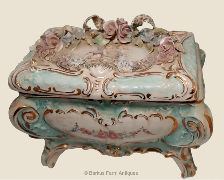 This trinket box with roses and cherubs measures 7″ x 5″ and is about 5.5″ high with the lid in place. There is a piece of royal-blue velveteen placed on the bottom of the interior by a previous owner. This same box mold is a known Cordey-branded item although the M.B. Cybis example is more elegant in technique.