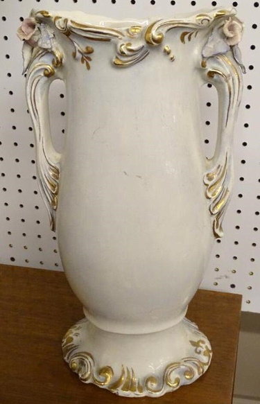 Here is the same M. B. Cybis vase with a slightly different treatment. Instead of the gentleman we have a spray of applied roses, but in all other respects the vases are the same. The red sticker is the same as one that was used on some Cybis items during the 1940s and possibly also the early 1950s.