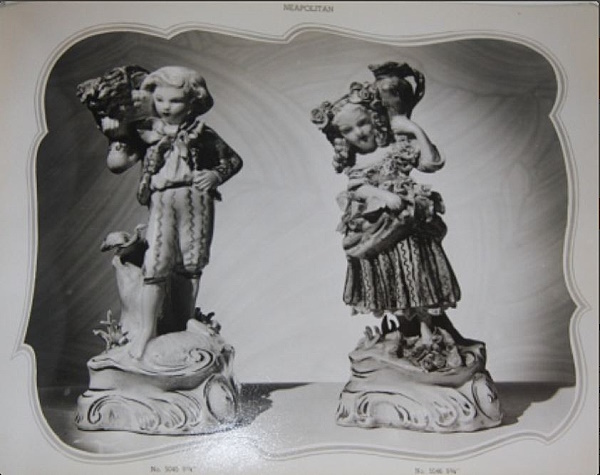 Their Cordey siblings do not have as much lace; their catalog page is titled Neapolitan. In the Cordey version, the girl is carrying a jug but I’m not sure what the M.B. Cybis girl is carrying; it looks rather like a stack of large pancakes! The Cordey boy also wears no hat.