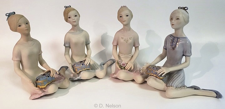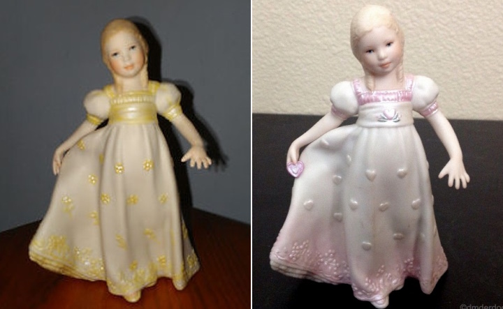 Certain Cybis porcelains are known for having alternate decorative retail versions of the originally-issued piece. The bunnies are a prime example, especially Bunny ‘Bon Bon’ who can boast having 13 of them! I have also found seven versions of Bunny ‘Snowflake.’ The creation of variants/spinoffs was less common among the human sculptures, however.
