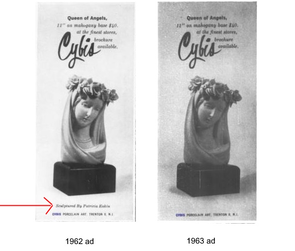 I would never have known who originally created this Madonna bust if I had not stumbled upon an ad that Cybis placed in The New Yorker in 1962. It clearly says ‘sculptured by Patricia Eakin.’ The following year’s ad does not have the attribution line; sadly, Cybis had become ‘allergic’ to publicly identifying the actual creators of the sculptures they made. I have gleaned nuggets of information about a few, however.