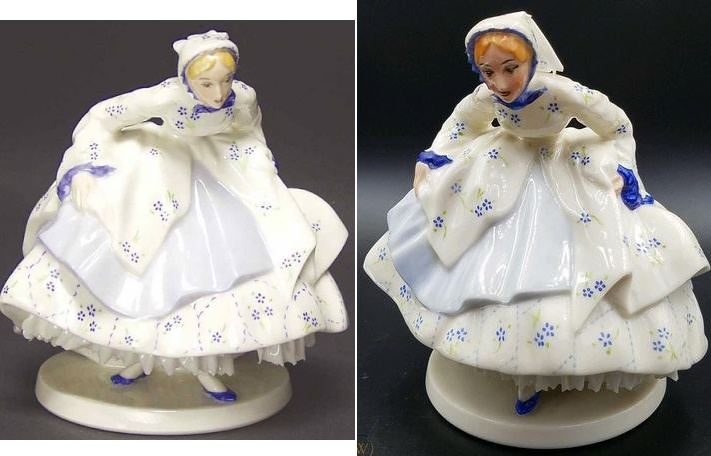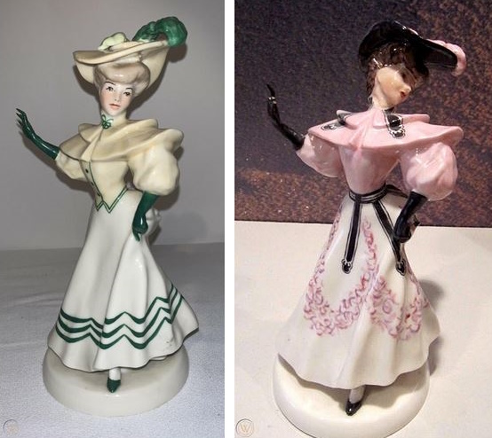 This blue ballerina is a typical example. The circa-2016 eBay seller described it as “Incredibly intricate with articulated fingers the width of a strand of yarn and a skirt so thin you can almost see through it. Hand painted with tiny pink rosebuds.” Indeed, the thinness of the porcelain was a hallmark of these Eakin ballerinas. They are about 6” tall and were produced intermittently between 1939 and 1953.
