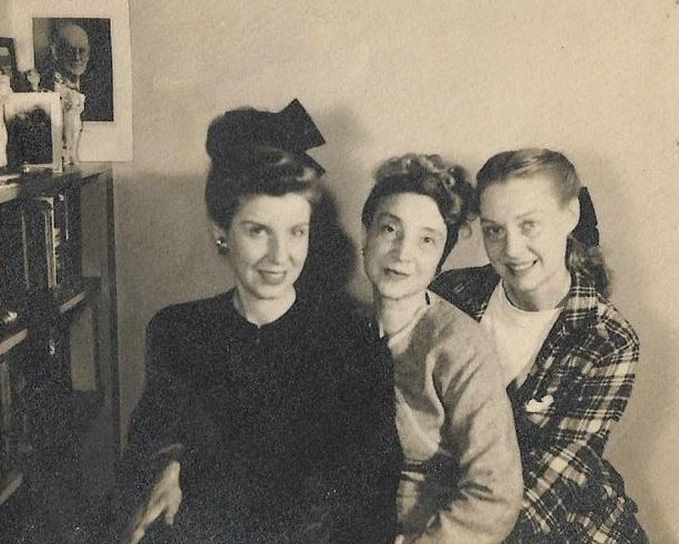 This photo shows Pat (at far right) with her mother Ruth (center) and sister Kathleen. It is undated, but from the clothing and hair styles appears to be from the 1940s. The man in the photo is probably Henry Eakin.