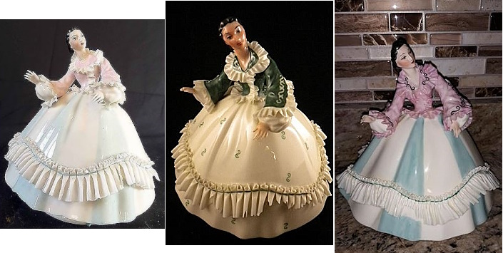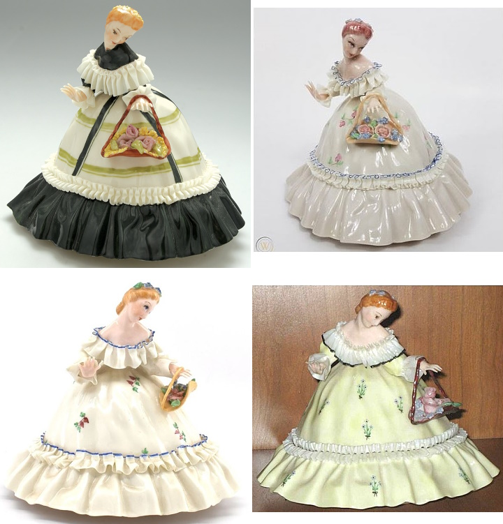 The American Costume Series featured women in historical costumes. Each design was named, and was made in different colorways and decorations. Even more importantly, many examples have Pat’s initials, PJE, on the underside as a mold impression.