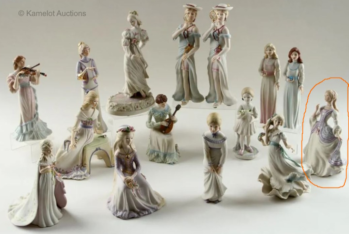 Finally, in February 2024 a Cinderella, Belle of the Ball appeared for sale online. The consignor was a former retailer of Boehm, Cybis, Royal Doulton, and other vintage art porcelain items. At long last, I would be able to examine multiple photos and solve the mystery!