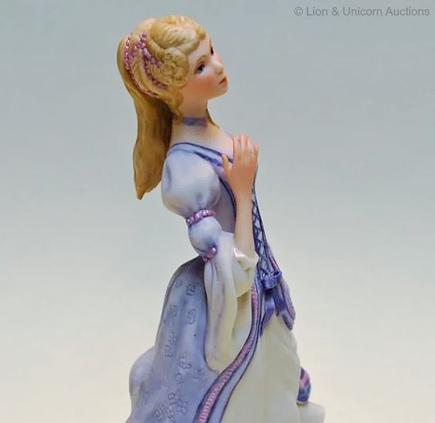Fast forward to the studio’s early-2000s website. At that time, there was indeed a Cinderella, Belle of the Ball as an available item. The photo above is the one that was actually on the Cybis website. I immediately noticed that she is damaged: One of the bow tails at the bottom of her bodice lacing is broken off. It seemed odd that the studio would use a damaged piece as their one and only photo! I also noticed that she was described as an Open edition, but because the Cybis website had so many other errors (incorrect photos, wrong or incomplete descriptions, or no photo at all) I assumed that the “Open” was merely another mistake. Was the ‘Golden Anniversary’ version a different colorway than this purple-and-lavender one? Never having seen a photo other than the one above, I had no way of knowing.