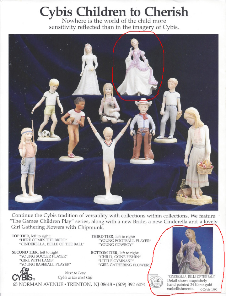 In April 2022, I finally acquired a full Cybis price list from 1990. Remember that the studio had shut down at the end of 1989 and didn’t officially re-open until later the following year. This October 1990 price list includes this third Cinderella, under the Children to Cherish collection heading: