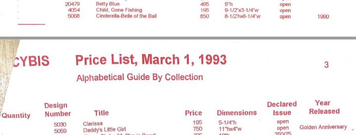 Look at this snip from a PDF of the March 1993 price list. Here we spot Cinderella, Belle of the Ball – same piece, no question about that – but now she is shown as an OPEN EDITION! This appears to give Cinderella, Belle of the Ball the dubious distinction of being one of only two Cybis pieces that were demoted from a limited edition to an open edition; as explained in this post, the other piece was Jumbles and Friend.