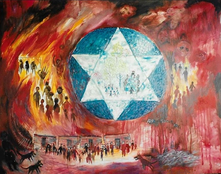 This oil painting, titled Holocaust, was created by George Ivers during the 1980s. The photo source states that it is currently in the ‘New Jersey Holocaust Museum’ but there does not appear to be a museum of that name nowadays.