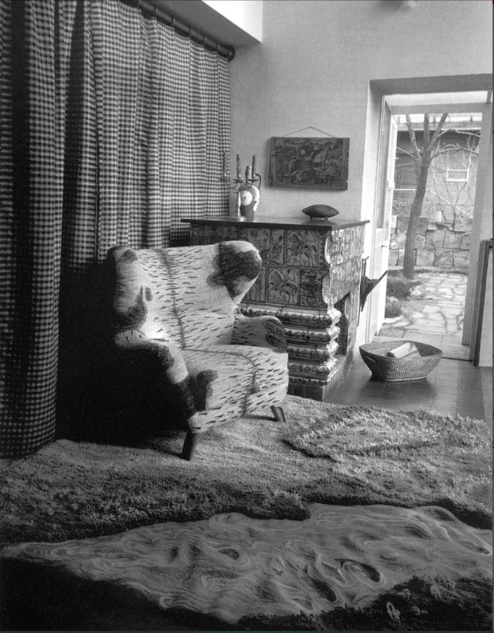 This is the only photograph of the Polish Pavilion’s dining-room display that I could find….and there is (part of) the Cybis carpet, complete with fish in the stream. What a shame that the photo was not taken (or printed) in color!