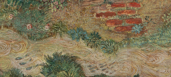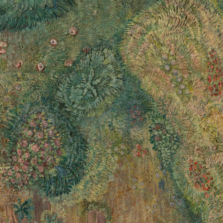 More floral details. Because this was described by Piotrowska as being a “carved rug” and having “raised weaving”, we know that the hillocks of foliage were not simply an optical illusion created by the weaver. The painter of this work was not identified specifically as being either Boleslaw or Marja; perhaps this, too, was a collaborative effort.