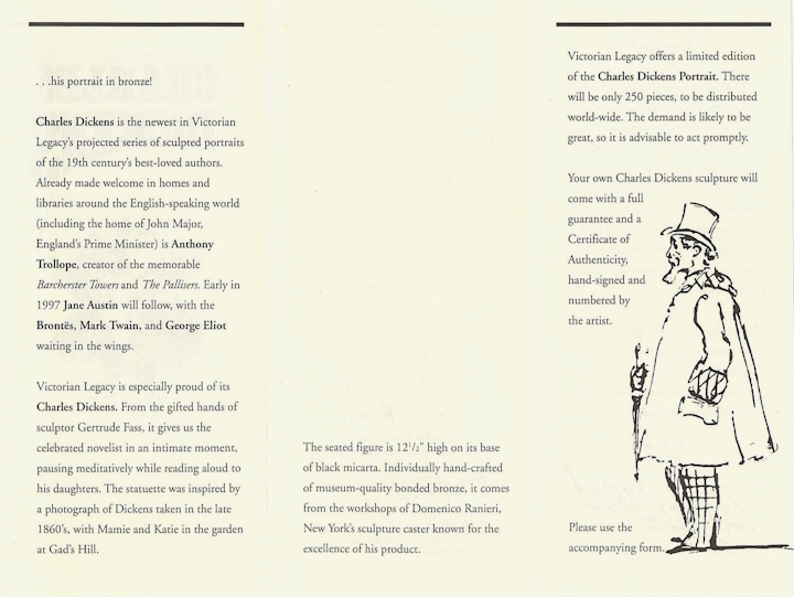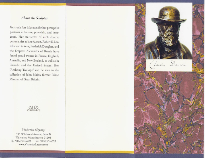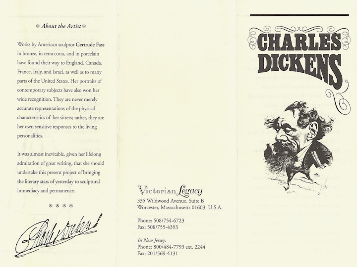 Victorian Legacy was the name of the company that Gertrude Fass established for her limited-edition bronze sculpture series during the 1990s. Based in Worcester, Massachusetts, the actual bronze castings were done by Domenico Ranieri at his sculpture foundry in New York. (Arturo Di Modica, creator of the famous ‘Wall Street Bull’, once worked for Ranieri.) The subjects of the Victorian Legacy sculptures were authors and other notables of the Victorian era.