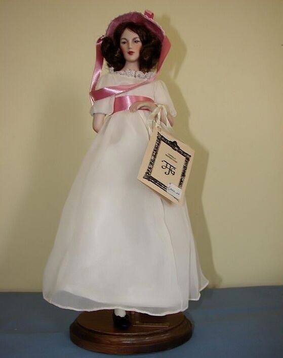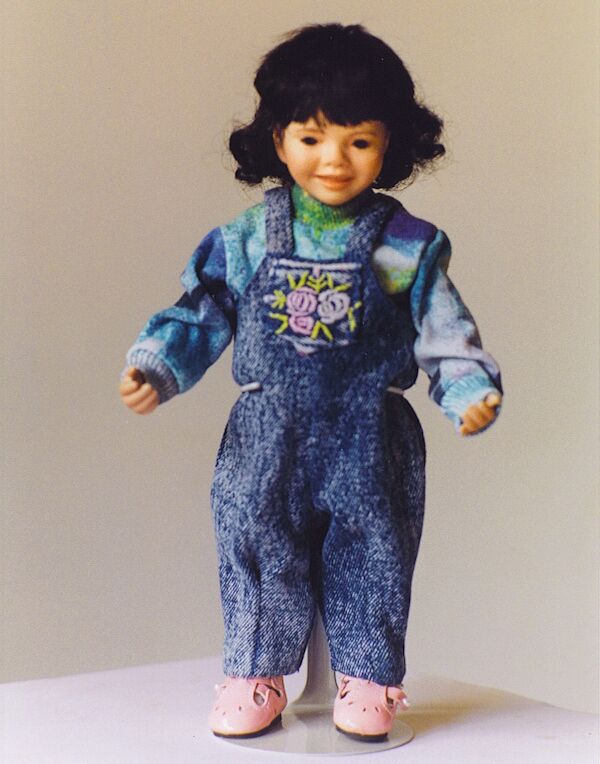 Tujays was a partnership of two sisters, Janet and Joyce (hence, “two Js” as a company name) Miko; they produced heirloom-quality dolls with an historical flair and fine attention to detail. Pinkie is 14.5” tall and came with a Tujays hangtag identifying Gertrude Fass as the designer. The accompanying stand bears a small brass plaque with the doll’s name.