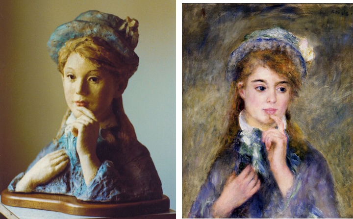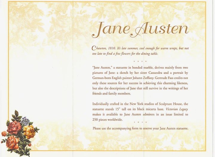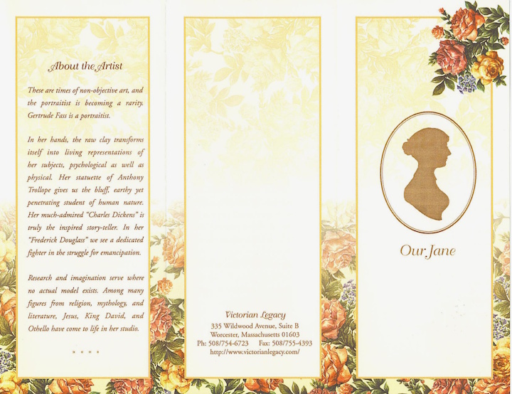 Clay model of Jane Austen, which was produced in bonded marble rather than in bronze. Bonded marble is also known as ‘cold cast marble’, ‘synthetic marble’, or ‘reconstituted marble’ and is a mixture of actual marble powder (between 80% and 90%) with a resin polymer bonding agent. The weight of a bonded marble product can be quite close to that of natural marble, depending on the percentage of marble powder that was used, but it is much more affordable. Jane is 15” tall and was an edition of 250. The Sculpture House Casting studio mentioned in the brochure has existed for more than 100 years and is owned by Michael Perrotta. The back cover of the brochure mentions two of her sculptures for Cybis: King David and Othello.