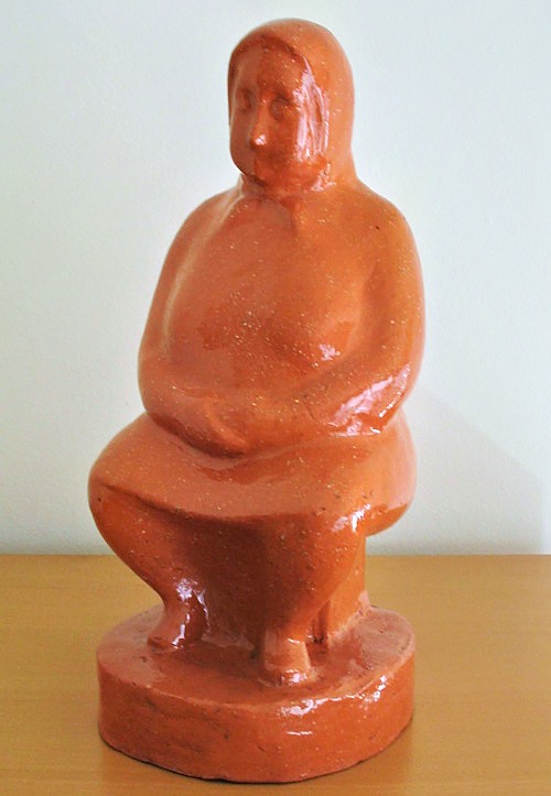 Glazed terracotta figure titled ‘fat lady waiting patiently.’