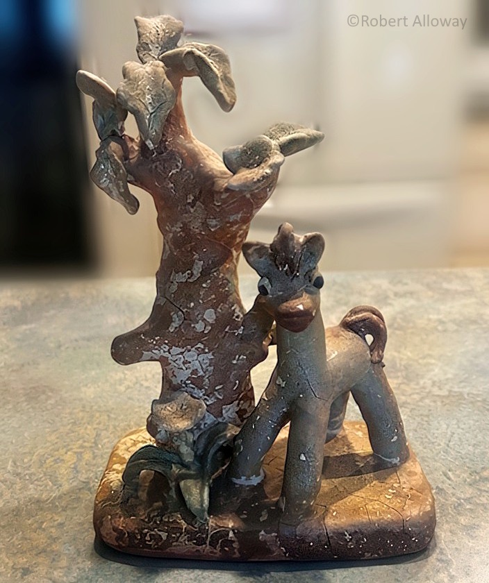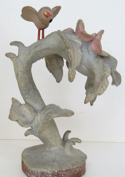 This primitive style bird-on-branch showed up a few years ago and, to be honest, I thought the ‘melty’ appearance of the branch had been a kiln accident! It is marked MC on the underside. However, just recently I was alerted to a second example that is not marked but is almost identical…showing that the branch appearance was indeed intentional. See the Early Birds post for the two compared.