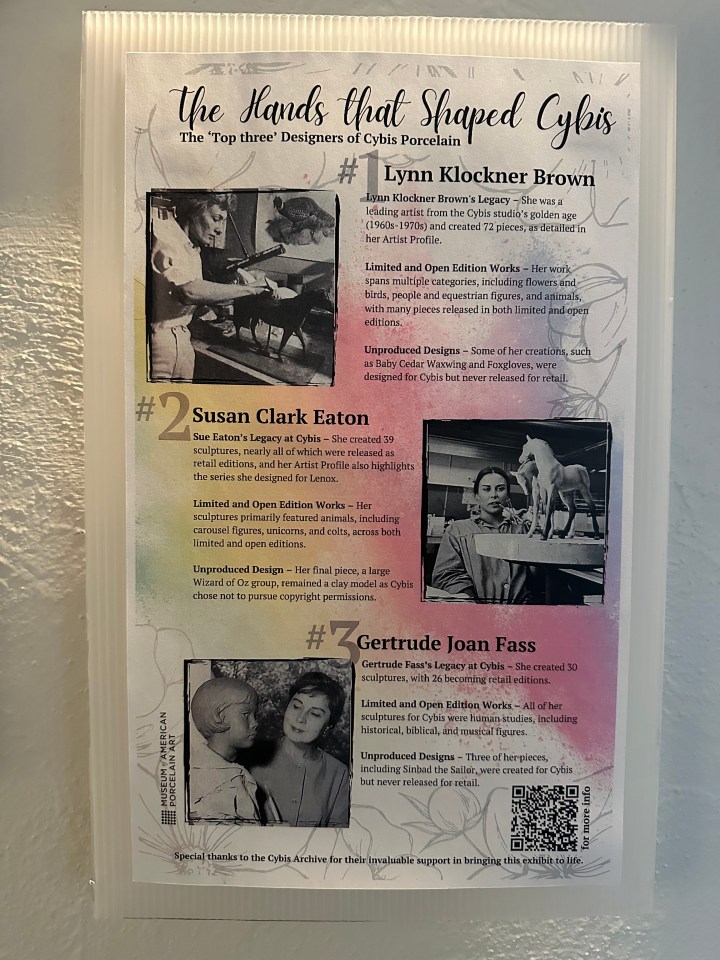At the bottom center is a panel honoring the ‘Top Three’ designers of Cybis porcelains, all of which are women: Lynn Klockner Brown, Susan Clark Eaton, and Gertrude Joan Fass. A complete list of each of their Cybis sculptures is in my recent Archive post announcing the Top Five. The photograph to the left of the panel is of Gertrude Fass, circa 1955.