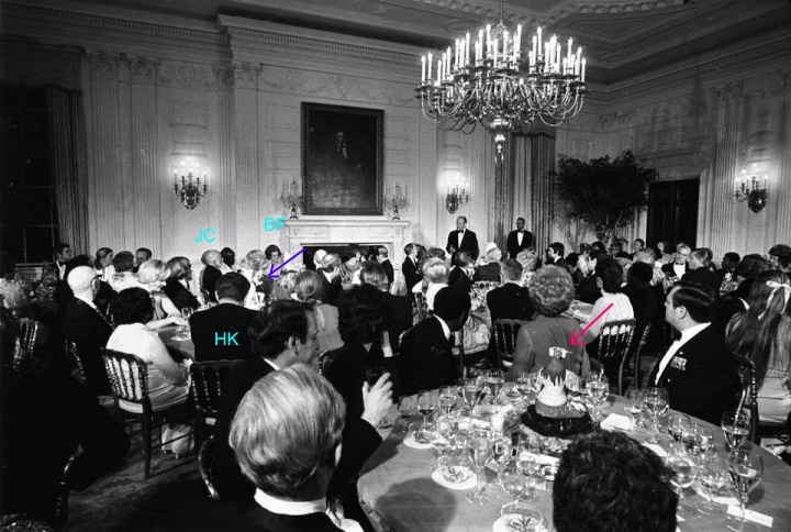 Table Six guests not pictured: Mari Anderson, wife of the chairman of Continental National Bank; Carl Gerstacker, chairman of Dow Chemical; William Keating, owner of the Cincinnati Enquirer; and Aminda Wilkins, wife of Roy Wilkins, the head of the NAACP. (Joette Shouse, a bigtime donor to the Wolf Trap Foundation for the Performing Arts, must have been bumped in order to make a seat available for you.)