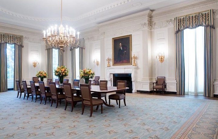 The large dining room, which is 36′ x 48′, has an 1869 Healy portrait of Abraham Lincoln over the fireplace. There is space for up to 140 guests; when not being used for a state dinner, it looks like this.