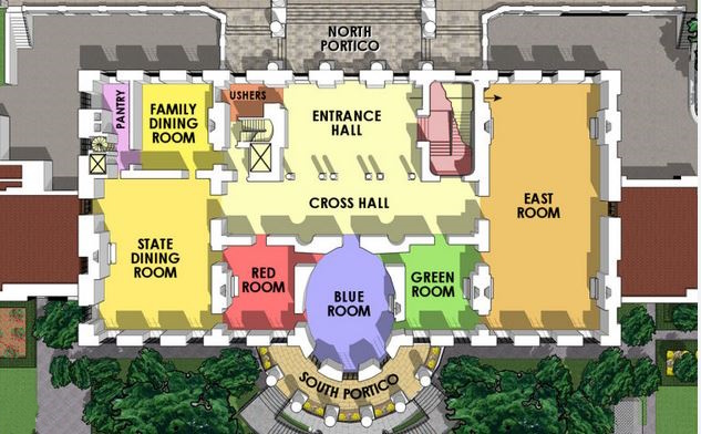 You entered the White House through the North Portico entrance (top center on this map) and walked through the Entrance Hall into the Cross Hall, which has the East Room at one end and the State Dining Room at the other.