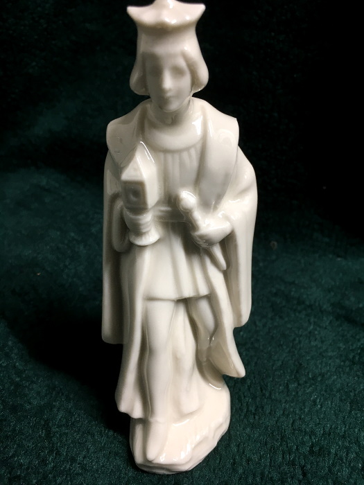 This is the lonely Cybis-marked King with Frankincense. See more views of him in his own Archive post. The 1950s list does not mention anything about the color of this Nativity series, but this example shows that they did at least make it in glazed white.
