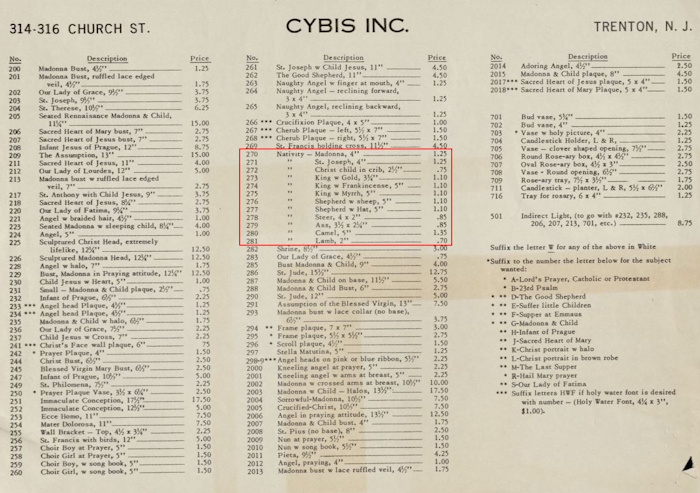 Although the Cybis wholesale list is not dated, we can make a good stab at it by comparing it with information available elsewhere. For example, I found the original copyright registrations by Holland Mold Company for these individual figurines; they were all registered in February 1952. This means that the Cybis wholesale list is highly unlikely to date from before that year. Based on what other religious items are not on this list, and the actual age of a number of other Cybis documents found within the same storage, my guess is that it was printed sometime between early 1953 and early 1955. “Circa 1954” sounds logical to me.