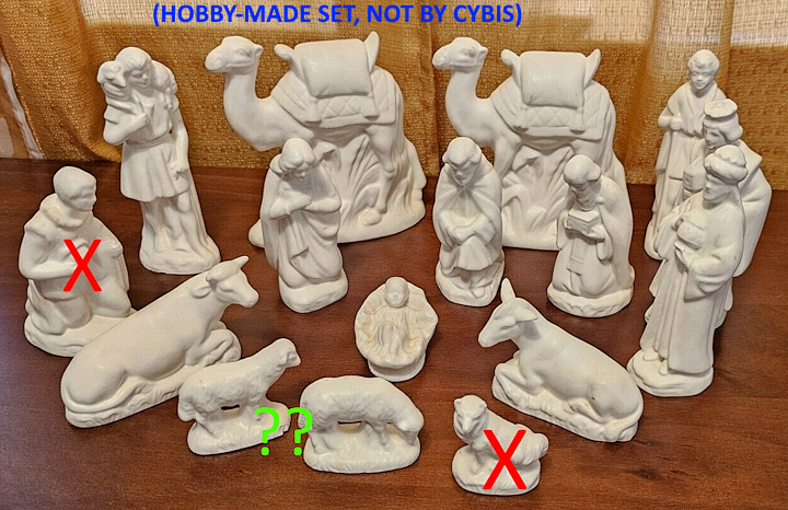 These photos show hobbyist-made sets in plain white and in a brown wash which is a paler version of the ‘Cypia’ finish that the studio used during the 1950s. I’ve X’d out any figurines that were not in the Cybis-produced 12-piece series. The question marks near the two sheep mean that at present, I have no idea which of these two sheep molds Cybis used.
