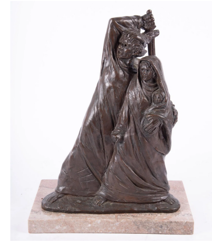 The bronze Exodus, an edition of 100, is 16” tall and 12” wide. His Cybis porcelain Exodus is a figure of a woman carrying a child, but is similar to this in style and shape.