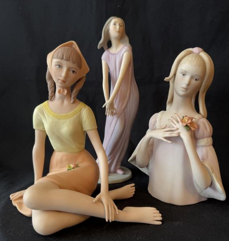 Ispanky female figures tend to have very similar facial expressions, as this group of three demonstrates. Fingers and toes are usually elongated, and hair styles are often simplistic – no ringlets or elaborate carved curls such as are often seen on Cybis sculptures.