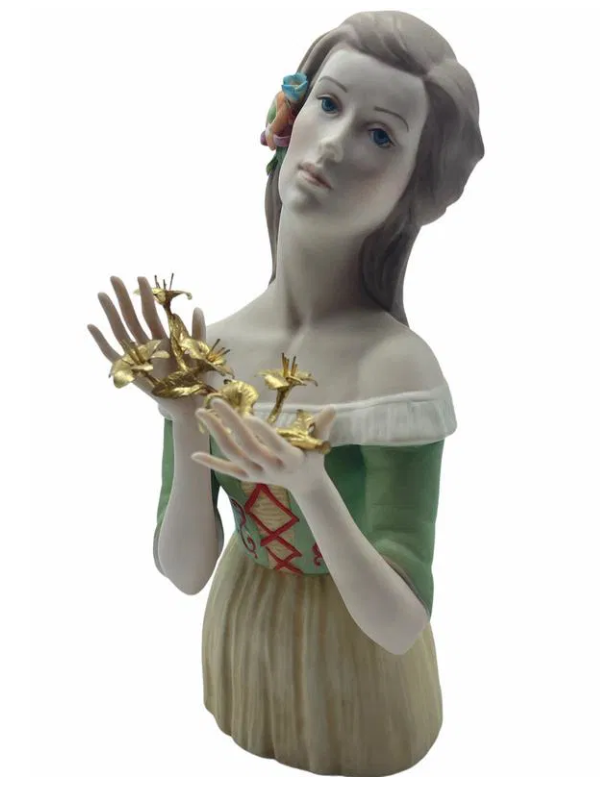 A very unusual five-edition series produced under the Ispanky branding in 1971 included an 18kt gold element. They are solid 18kt gold, not merely gold-painted porcelain, and were attached to the sculpture with glue. The backstamps say Ispanky Arts Ltd. Each of these also had an all-porcelain counterpart.
