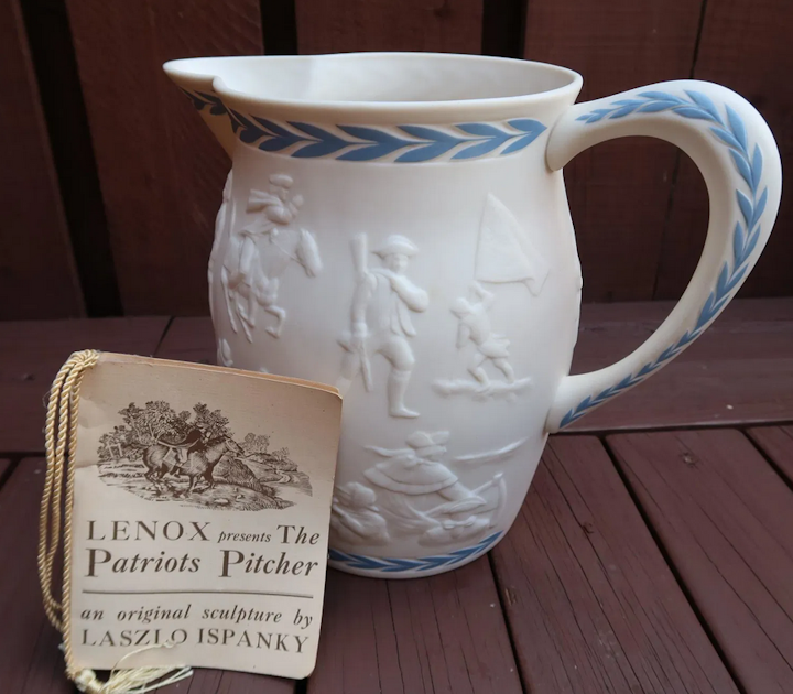 The Ispanky-designed Patriots Pitcher manufactured by Lenox features scenes from the Revolutionary War in relief on the surface.