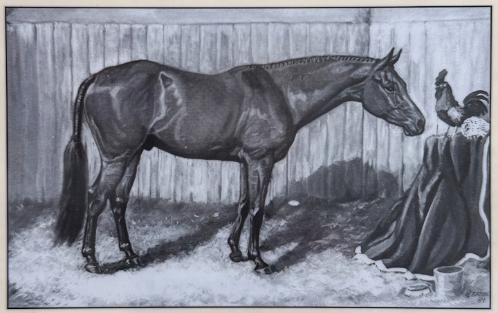 He wanted carousel horses done in oils…on a 7-by-10-foot canvas. He ordered it just before Christmas. I had to wait until January for the canvas to come. I worked on that thing eight to ten hours a day, ask Chuck if I didn’t, and by God, I delivered it two weeks ago.