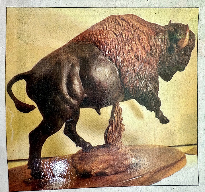 This American Buffalo is carved from basswood and mounted on a black walnut base. Basswood (Tilia americana, also known as American linden) is a favored wood for carving because although it is a hardwood, it is lighter than most and has a straight grain and a fine uniform texture. Most traditionally-carved carousel horses are of basswood.