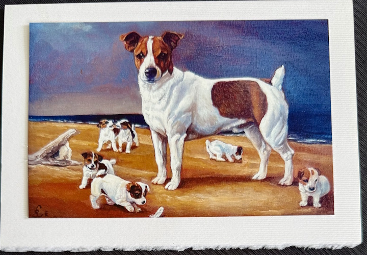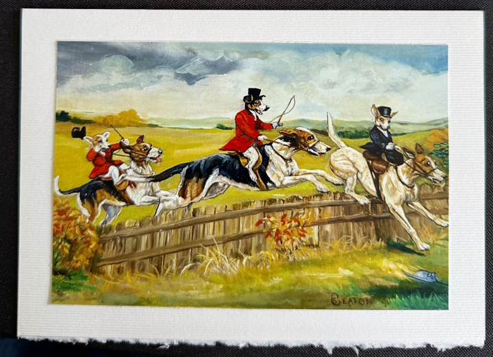 These two greeting cards were printed from two of Sue’s paintings. The dogs are Jack Russell Terriers, one of Sue’s favorite breeds. The whimsy and irony of the hunt participants is inescapable!