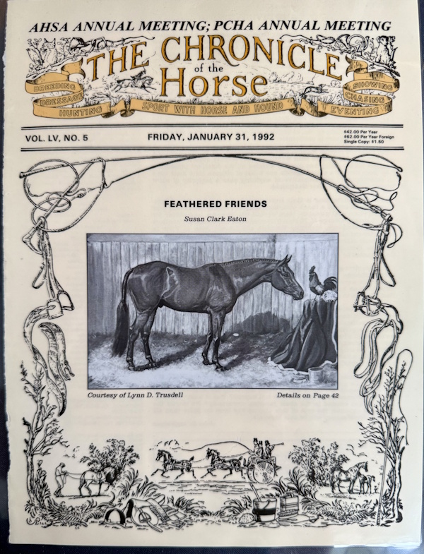The January 31, 1992 cover of The Chronicle of the Horse featured her 1989 equine study titled Feathered Friends.