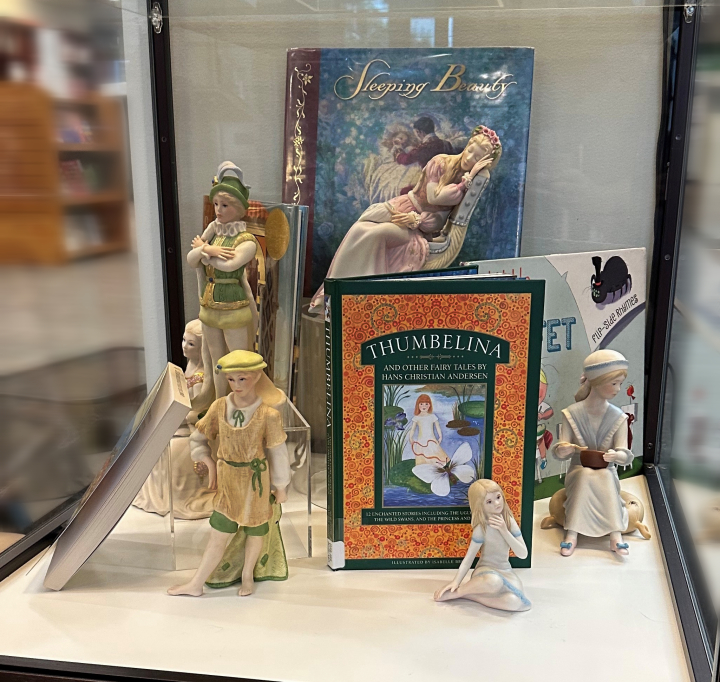 The lower shelf contains Sleeping Beauty, Little Miss Muffet, Thumbelina, the first (pink) Rapunzel, and the retail colorways of The Prince and The Pauper. Although a two-case display would have allowed more storytime characters to be included, the heights of the two lower shelves are perfect for younger patrons.