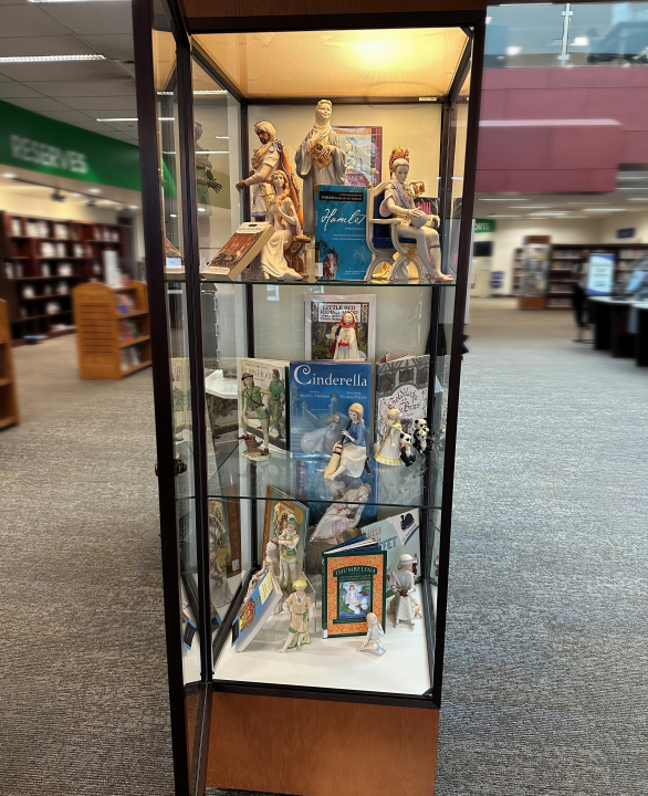 The upper shelf displays Lady Macbeth, Hamlet, Othello, Eleanor of Aquitaine (who appears in Shakespeare’s Henry V), and Queen Guinevere (from Tennyson’s Idylls of the King and E.B. White’s The Once and Future King.) The original two-displays plan would have enabled the inclusion of Ophelia, Desdemona, King Arthur, Juliet, Camille, Jane Eyre and Beatrice as well.