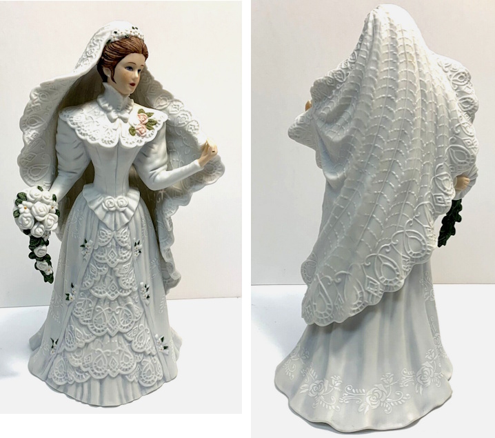 The Centennial Bride is 8.25” tall and was manufactured in Taiwan. Accompanying literature identifies this item as part of the ‘American Fashion Figurine Collection.’ Because this piece is cited as being a 1987 item, it is clear that Jolan was doing freelance work for Lenox while she was an in-house artist at Cybis. This appears to have been a multi-piece collection of annual full-color bisque figures, some of which are actually quite well made for an offshore, mass-market item. The circa-1980s figurines in this series were made in Japan but the 1990s ones, such as the Centennial Bride, were made in Malaysia and Taiwan; the quality difference is noticeable, with the Japan-made figures being of better workmanship.