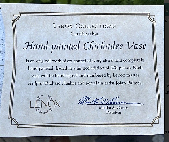 A quick search for ‘Lenox Four Seasons Vase’ brings up a Spring design of mourning doves within dogwood branches, and a Winter design of cardinals amid holly. I was not able to find any photos of signed Hughes/Palmai counterparts of those, but there was a no-longer available Facebook post describing a “hand painted cardinal vase created by Lenox master sculptor Richard Hughes and hand painted by master artist Jolen [sic] Palmai, issued in a limited edition of 100”. This shows that there must have also been a painted/limited version of the Spring vase as well.