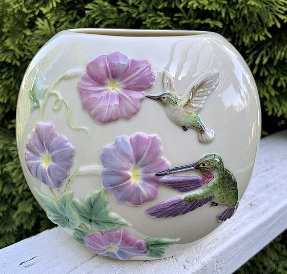 The Hummingbird Vase is 5.25” high and was designed by Richard J. Hughes; the detail decoration and color scheme is by Jolan Palmai. These vases were cast in the USA (probably at Lenox), shipped to Hungary to be painted, and then shipped back to the USA for distribution. The autographed underside identifies this as an edition of 50. Lenox also produced this same vase mold in plain white with a thin gold rim (no other decoration) as part of a ‘Four Seasons Vase Collection’; the underside backstamp identifies this one as ‘Summer – the Hummingbird and Morning Glory’. They are undated, marked as being made in the USA, and can be readily found on eBay.