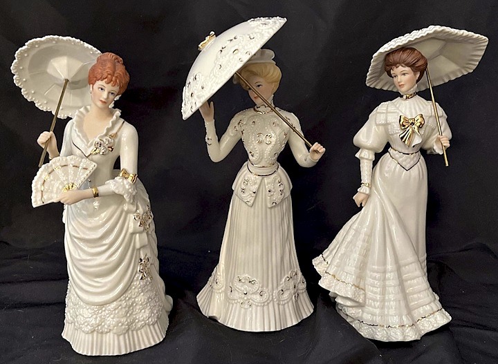 The circa-1990s series was titled ‘Victorian Ladies of Fashion’ and also included Sunday Stroll and Picnic in the Park. Other designs were added but not all of them had the same high-relief details seen on these three, which may have been among the first of that series. The workmanship of the other two pieces is so similar to Morning Promenade (center) that it’s likely they were Jolan’s work as well. The parasols were shipped as separate accessories, unlike the one that the Cybis Madame Butterfly carries which was affixed to her hand with porcelain slip or glue and not meant to be removeable.